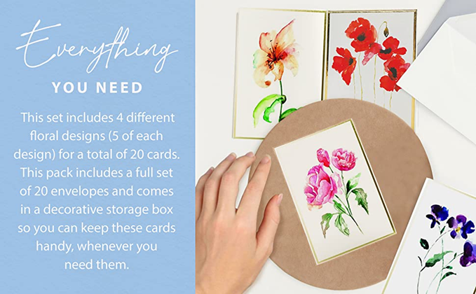 - EVERYTHING YOU NEED: This greeting’s kit includes 20 cards, 5 per watercolor floral design, and 20 white envelopes. A decorative storage box keeps the cards easy to reach any time of the year.
