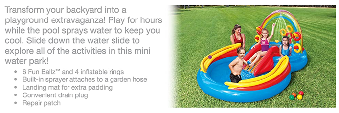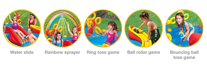 • Center includes water slide, wading pool, water sprayer, ring toss game (with 4 inflatable rings)