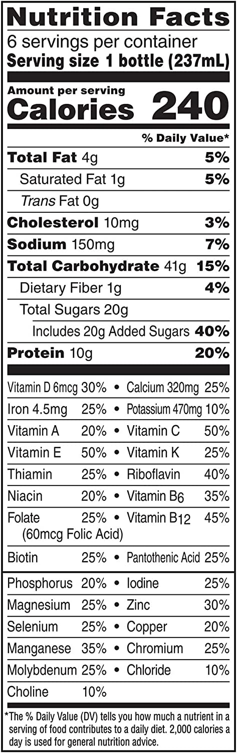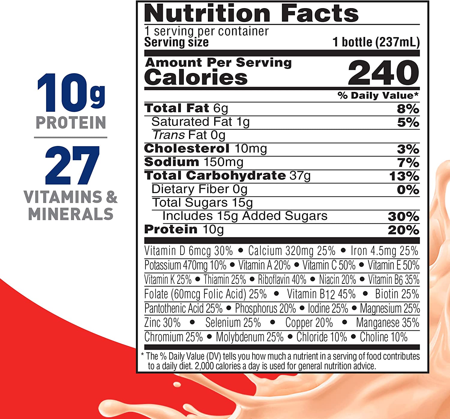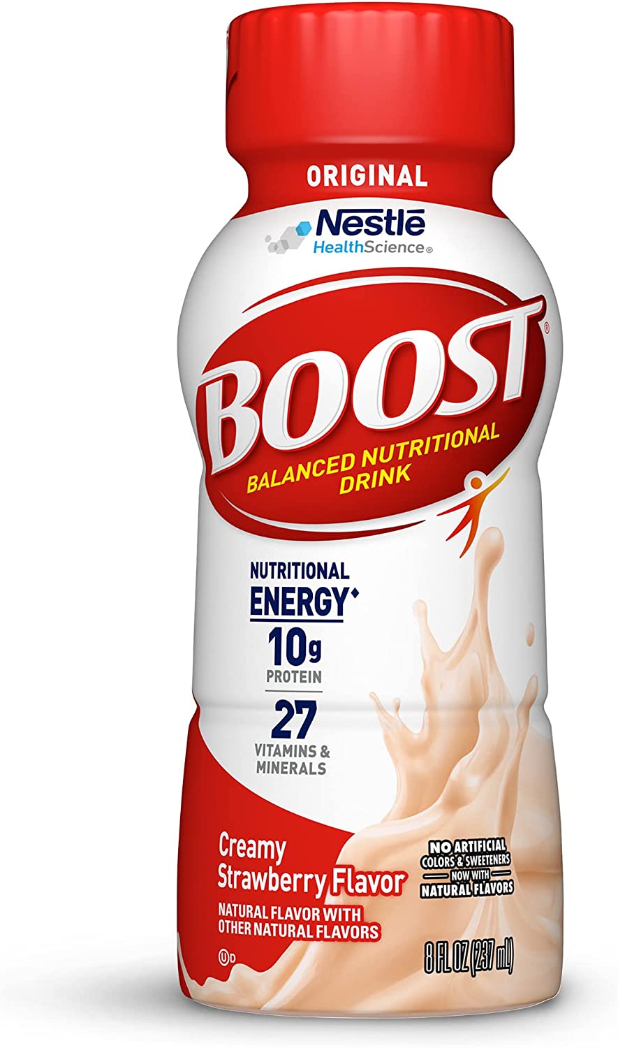 BOOST Original: This drink is designed to provide nutritional energy with 240 nutrient-rich calories and B-vitamins to help convert food to energy, plus 10g protein and 27 vitamins and minerals for balanced nutrition