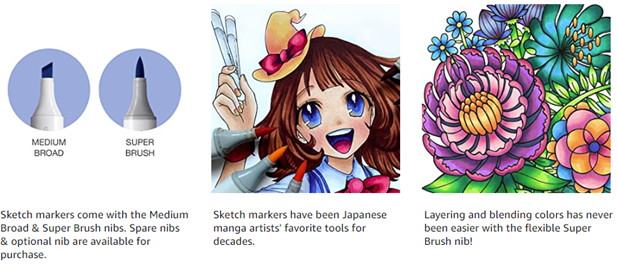 - 【REPLACEABLE NIBS】SUPER BRUSH & MEDIUM BROAD: The flexible brush nib is ideal for blending, shading, and for drawing both thick and thin strokes. The broad nib is perfect for producing consistent lines and for adding details to your creations. The broad nib can be also used with the Copic ABS (Airbrush system).