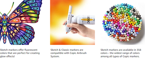 Copic Sketch is an ultra-blendable marker made with fast-drying, non-toxic, premium quality alcohol-based dye ink.