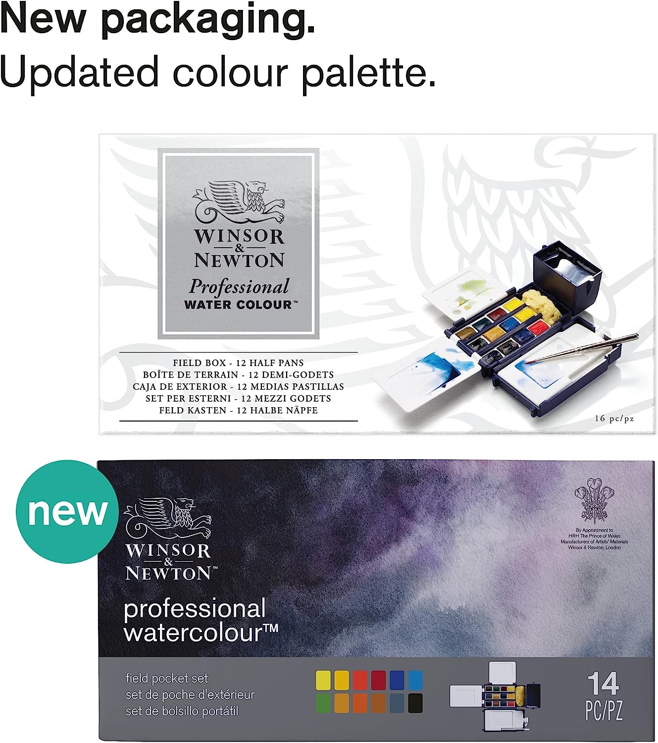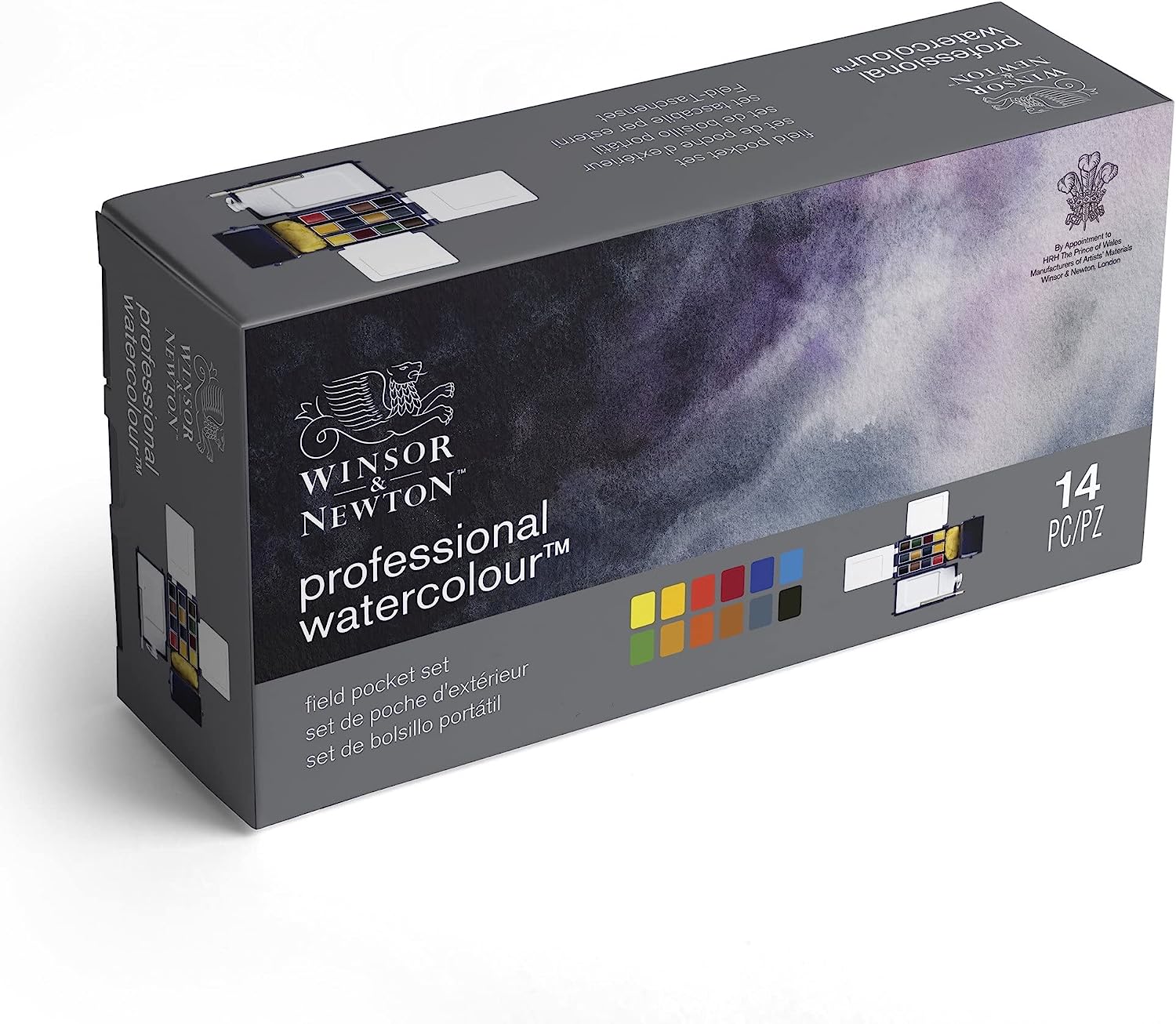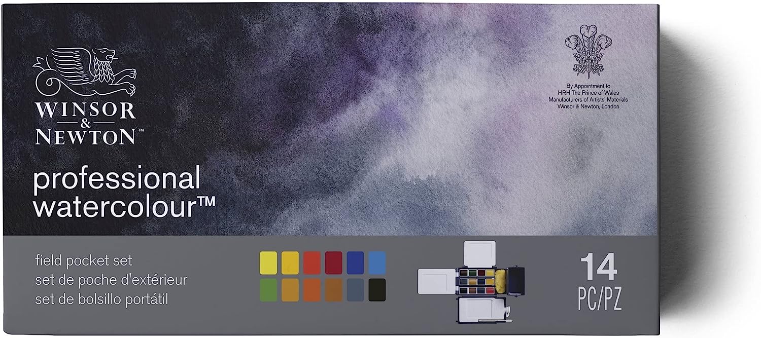 Winsor & Newton Artists' Water Color offers artists the widest and most balanced choice of pigments with the greatest possible permanence. The brilliance, transparency, and purity of color is unparalleled to any other water color. This special pocket-sized field box unfolds into a palm-size kit that contains the following: 2 palettes for mixing, a Water container & bottle, Sponge, a folding travel brush, and 12 colors in half pans. The colors include one each of Winsor Lemon • Cadmium Free Yellow • Cadmium Free Red • Alizarin Crimson • French Ultramarine • Winsor Blue (Green Shade) • Permanent Sap Green • Yellow Ochre • Burnt Sienna • Burnt Umber • Payne's Gray • Ivory Black.