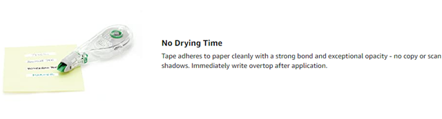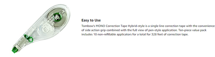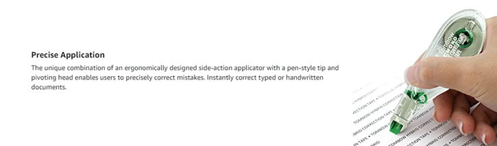 Hybrid-style applicator combines the convenience of a side-action dispenser with the full view of a pen. Pivoting head provides ultra-smooth tape application. Makes instant corrections with no drying time on all paper types. Retractable tip cover protects white breakproof tape. Correction Tape Type: Non-Refillable; Pen-Style; Global Product Type: Correction Tapes; Line Coverage: 1; Tape Width: 0.17 in.