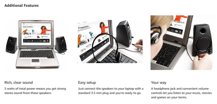 With convenient controls and an easy setup, These compact speakers make getting rich stereo sound simple. 5 watts of total power deliver clear stereo sound for your music and movies. Plus, the front-facing reflex port provides powerful bass to your audio experience. Easy-to-use controls are located on the right speaker to provide quick access to power and volume. Speakers connect to your laptop, computer, smartphone, tablet and more with a standard 3.5mm plug. Refer instruction manual for troubleshooting steps.