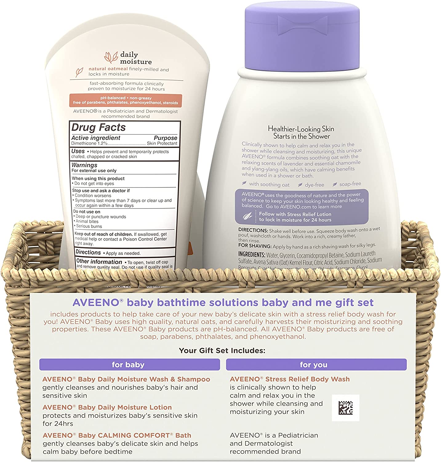 4-piece Aveeno Baby Mommy & Me Daily Bathtime Solutions Gift Set is a collection of baby bath essentials in a convenient, reusable wicker basket that includes everything you need for bath time with your little one, plus a bonus for mom
