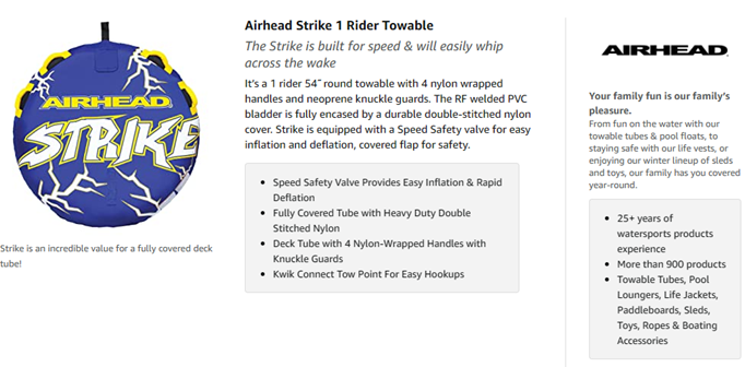 | Included Components | Kwik Tek AHST-23 Airhead Strike 54" 1-Rider Towable |