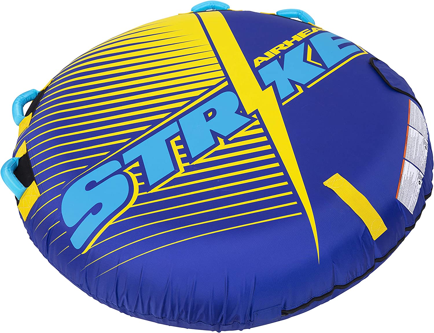 AIRHEAD STRIKE is an incredible value for a fully covered deck tube! It's a 1 rider 54 in. (deflated) round towable with 4 nylon wrapped handles and neoprene knuckle guards. The RF welded PVC bladder is fully encased by a durable double-stitched nylon cover. STRIKE is equipped with a Speed Safety valve for easy inflation and deflation, covered flap for safety.