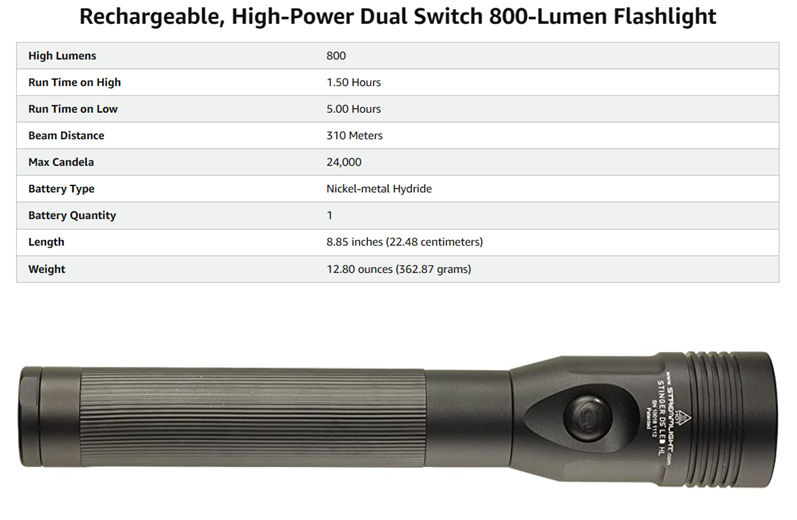 The Streamlight 75458 Stinger DS LED HL is a high lumen flashlight that provides 800 lumens of maximum illumination. Its wide beam pattern gives you a bright flood light that will light up the area around you, and the switches on the head and tail cap provide maximum versatility. Compact and extremely powerful, the Stinger DS LED HL rechargeable flashlights offer 3 microprocessor-controlled intensity modes, strobe mode and the latest in high power LED technology. The Stinger DS LED HL includes a second independent easy to locate tactical tailcap switch. The combination of rechargeable batteries and the C4 LED results in one of the lowest operating costs of any flashlight made. 3 Lighting Modes plus Strobe. High for maximum illumination: 800 lumens; 310m beam, runs 1.5 hours, 24,000 candela; Medium for intense brightness and longer run time: 400 lumens, 219m beam, 2.5 hours, 12,000 candela; Low for extended run time: 200 lumens, 155m beam, runs 5 hours, 6,000 candela. 3-Cell, 3.6 Volt Ni-MH sub-C battery, rechargeable up to 1000 times. Smart PiggyBack charger: Fully recharges within 7.5 hours (5V/1A USB input) or 4 hours (12V DC input). Machined aircraft aluminum body with non-slip rubberized comfort grip; anti-roll rubber ring included. IPX4 water-resistant; 1 meter impact resistance tested. Unbreakable polycarbonate lens with scratch-resistant coating. LED technology, impervious to shock with a 50,000 hour lifetime. 8.85” (22.48 cm); 12.8 oz (364 g). Serialized for positive identification. Limited lifetime warranty.