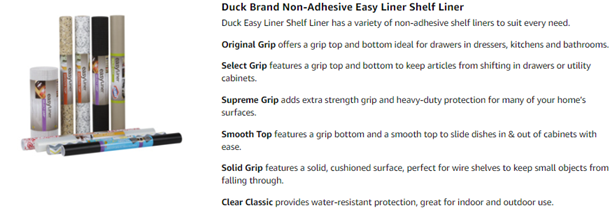 Featuring a non-adhesive grip top and bottom, you can use Select Grip EasyLiner Brand Shelf Liner in almost any type of drawer or utility cabinet to protect against scratches and keep your items in place. This shelf liner is easy to remove or replace and is available in a variety of colors, making redecorating a breeze. Pro Tip: Cover narrow drawers and cabinets with 12" and use 20" for large drawers and cabinets.