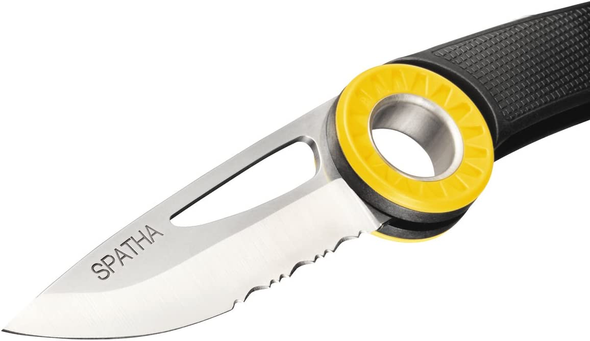 The SPATHA clippable folding knife is designed to accompany the climber on every outing. The profile of the blade allows easy cutting of ropes and cordage. It has a carabiner hole for attaching the knife to the harness. It is easy to manipulate with its textured wheel, even when wearing gloves, and can be locked in the open position.