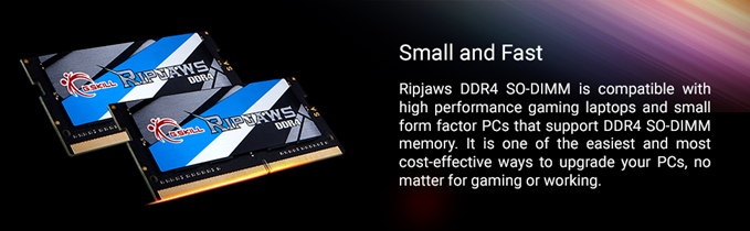 G.SKILL RipJaws DDR4 SO-DIMM kit is the ideal system upgrade and provides faster data transfer and higher energy efficiency than ever. Experience a new standard of speed with RipJaws DDR4 SO-DIMM today!