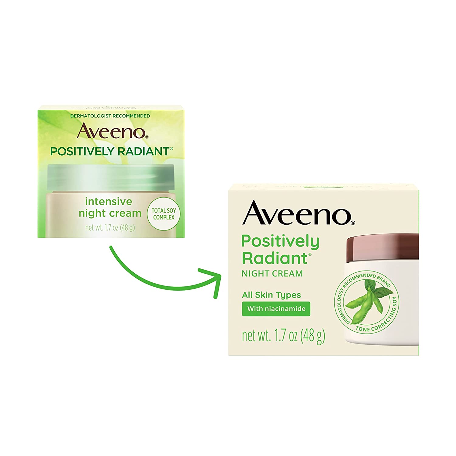 - Aveeno Positively Radiant Night Cream with soy gently improves skin tone and texture, helps reveal brighter, more radiant looking skin. Use in your nightly skincare routine to reduce the look of dark spots and reveal healthy-looking skin