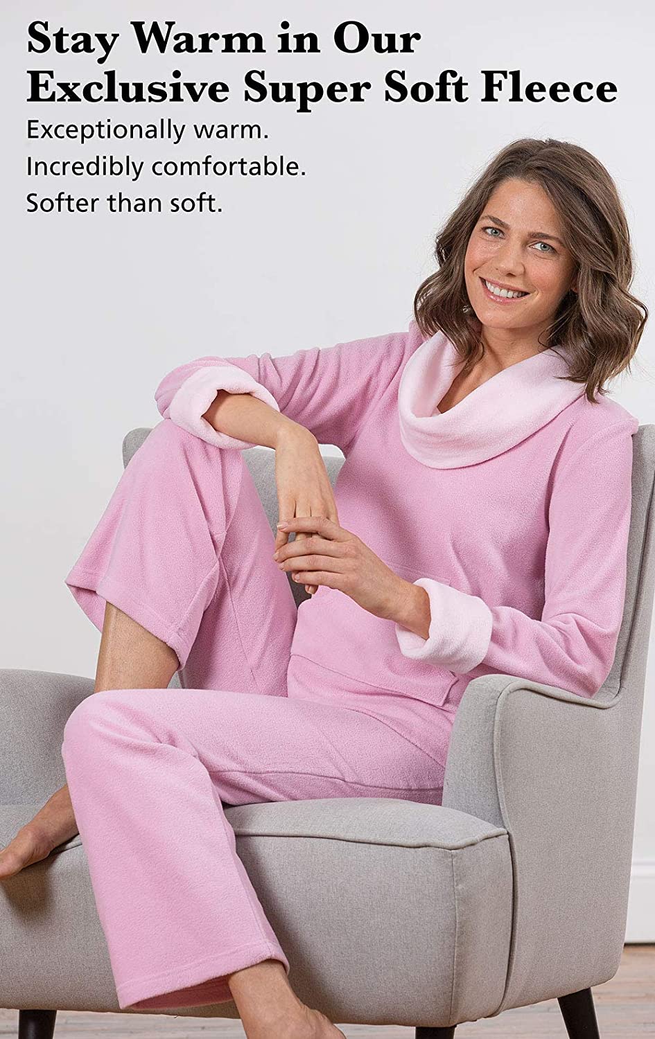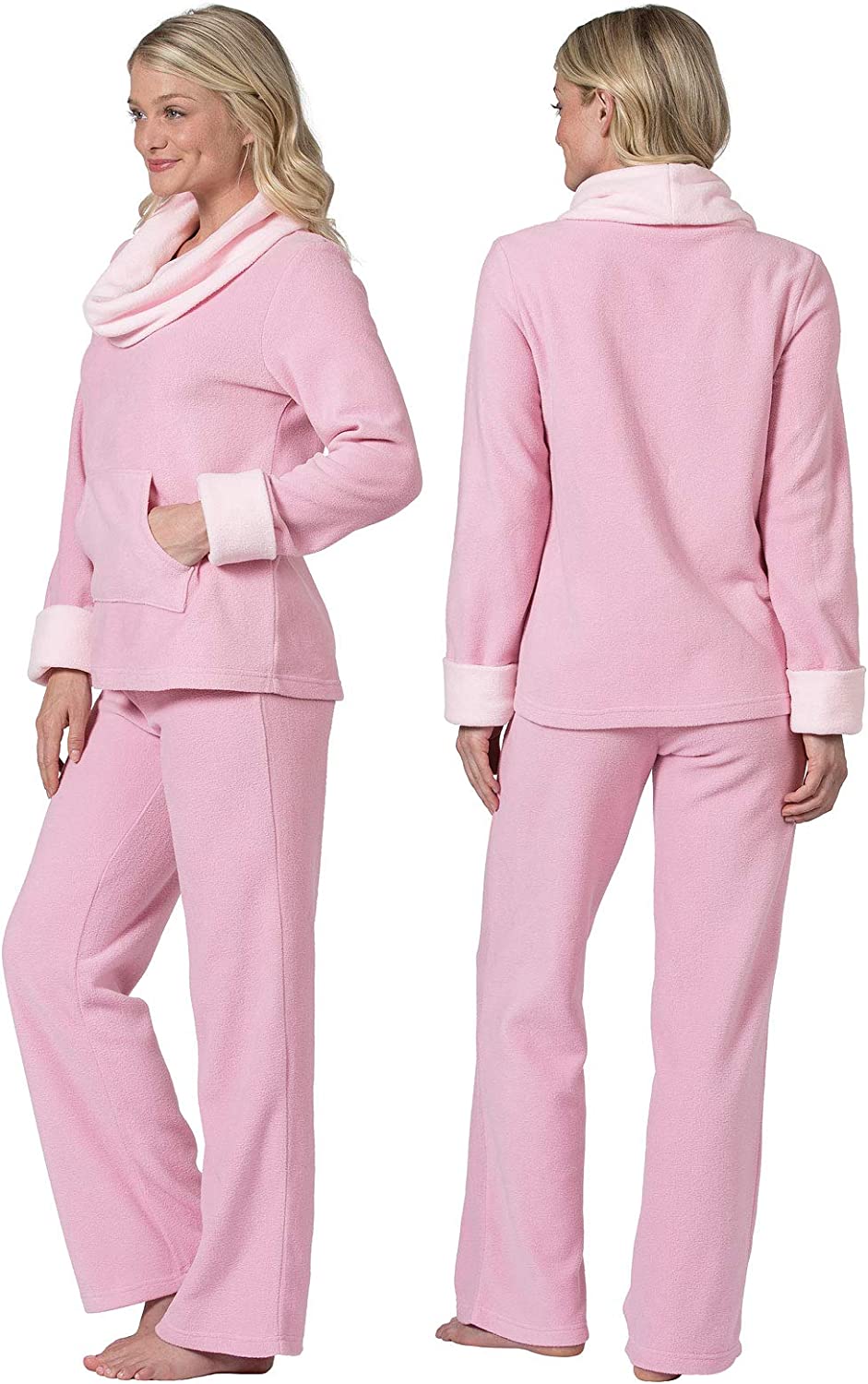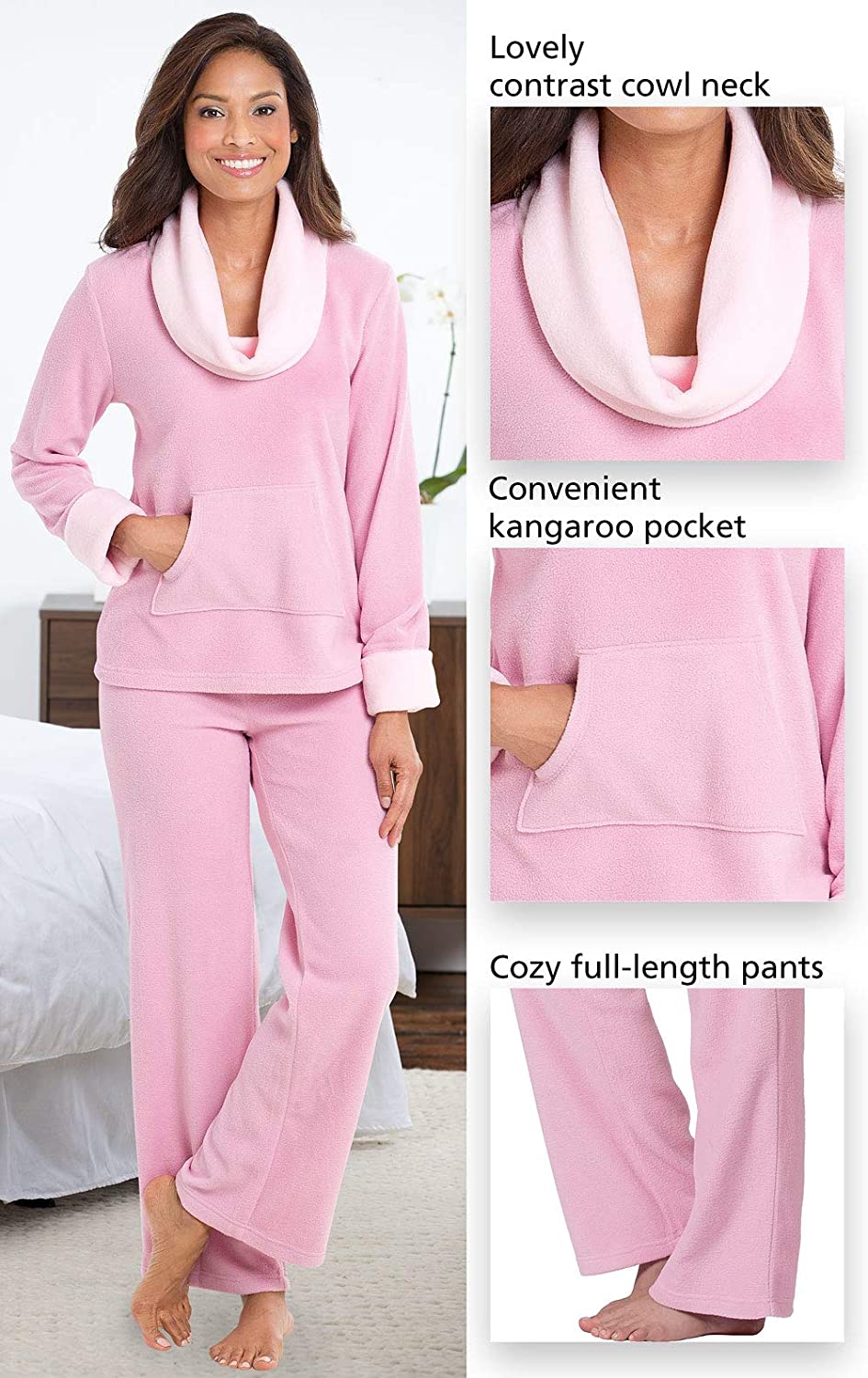 • Warm women's pjs - Super-sweet pajama set featuring a long-sleeved cowl-neck fleece top with kangaroo pockets plus a pair of relaxed leg matching pants