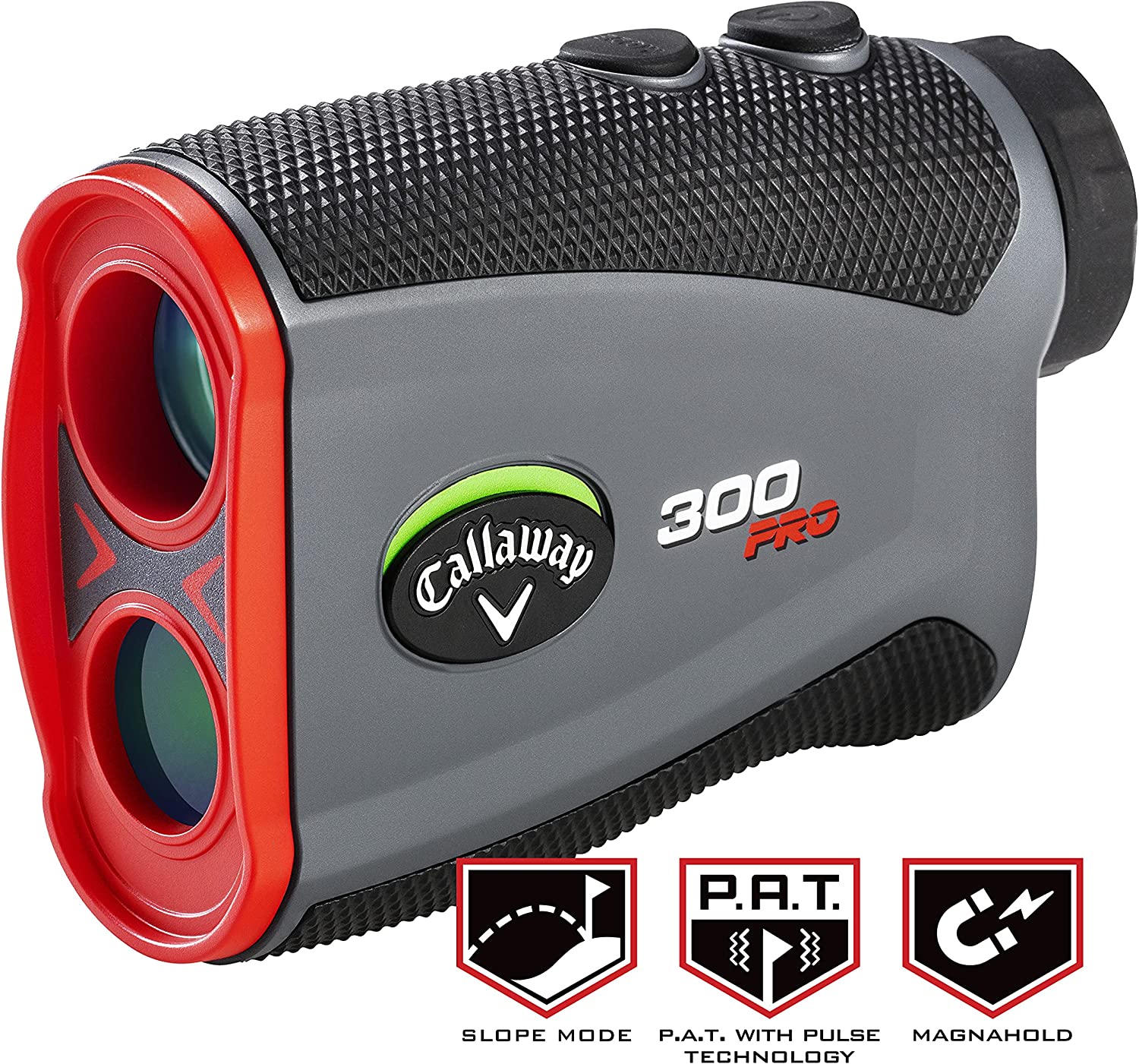 New and enhanced for 2021, the Callaway 300 Pro Laser Rangefinder continues to fulfill your core distance measurement needs to maximize your game. It is lighter and more compact than its predecessor, and now features P.A.T (Pin Acquisition Technology) with Pulse, which delivers a short vibrating "burst" to confirm that you’ve locked onto the pin. It also now features Magnahold, a powerful integrated magnet that allows you to securely fasten the unit to the cart frame for quick and convenient access during the round. The Slope feature, which automatically calculates adjusted distances due to elevation changes, now comes with a highly visible, external on/off switch that can be easily disabled for legal tournament play. Whether you’re trying to pick the right club to carry that fairway bunker, or firing at the flagstick of an elevated green, you'll now be able to take dead aim with extreme confidence!