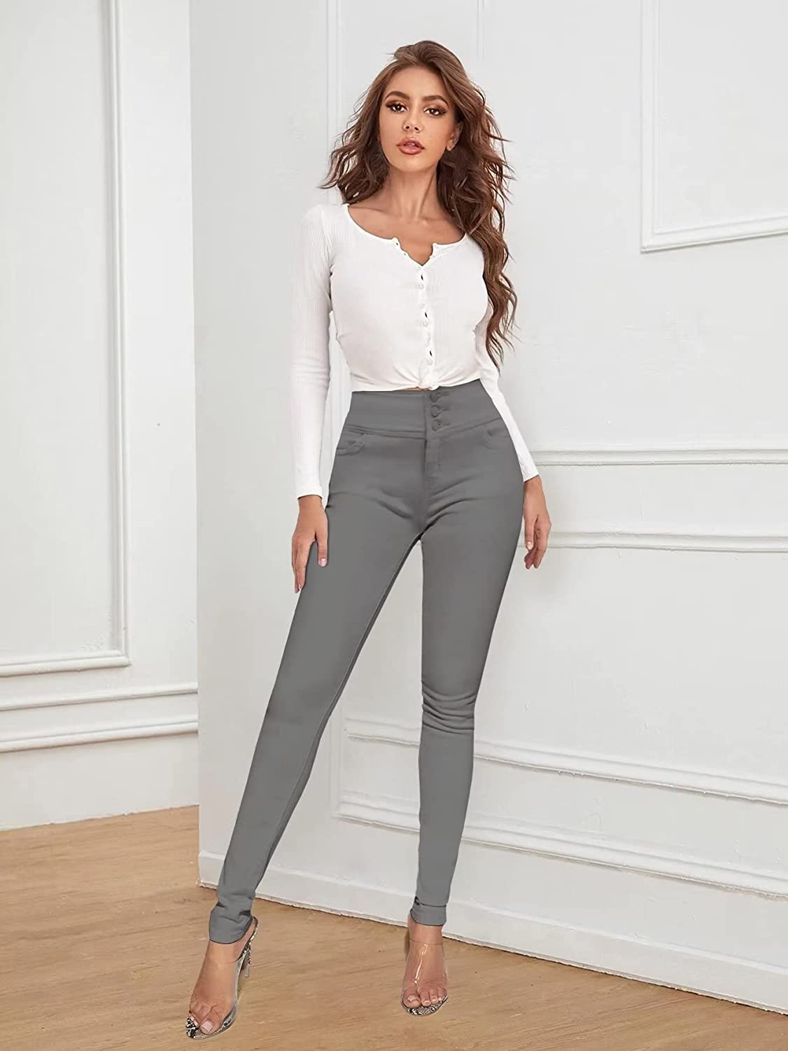 Women Butt Lift 3 Buttons Wide High Waist Stretch Denim Skinny Jeans with Short/Long Inseam