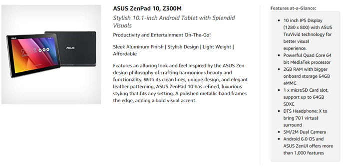 ASUS ZenPad 10 delivers exceptional performance with Quad-core processor, 2GB memory and 16GB on board storage. It also has any-way-up USB-C, rapid fingerprint security, and high-capacity 4680mAh battery to keep the entertainment going.