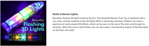 - LIGHT DISPLAY. Equipped with beautiful, flashing lights, this train will deliver a spectrum of multi-colored 3D effects that can be seen on the top and through the windows. Turn off the room lights for a mesmerizing display on the floor and walls!