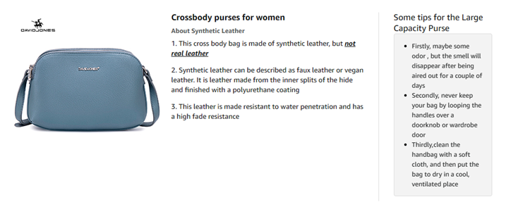 BRAND:DAVIDJONES purses for women Designed in French since 1987 and Distributed in more than 100 countries.Great stylish and designer handbags for women and girls.Excellent craftsmanship and refined good quality leather like PU women purse.Decent quality women handbags with affordable price.