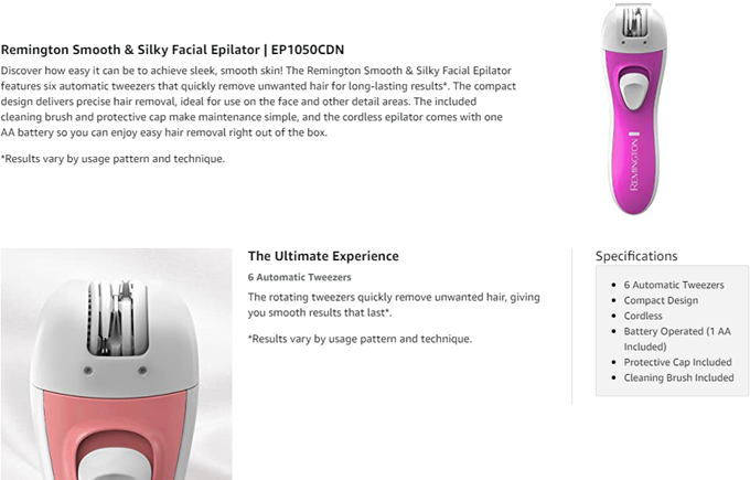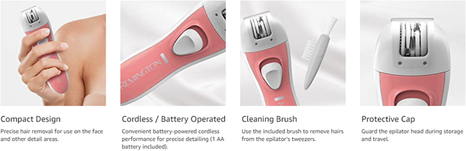 Color: Color May Vary Discover how easy it can be to achieve sleek, smooth skin. The Remington Smooth & Silky Facial Epilator features six automatic tweezers that quickly remove unwanted hair for long-lasting results. The compact design delivers precise hair removal, ideal for use on the face and other detail areas. The included cleaning brush and protective cap make maintenance simple, and the cordless epilator comes with one AA battery so you can enjoy easy hair removal right out of the box. Results vary by usage pattern and technique.
