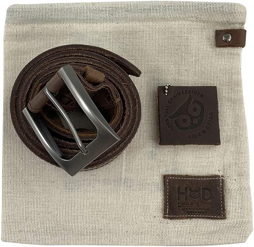 HANDMADE FROM SOFT & ATTRACTIVE FULL GRAIN LEATHER: Hide & Drink’s belts are hand cut and handcrafted using the highest quality of leather that you will find, namely Full Grain Leather. The quality of this leather ensures a long lasting life and durability. After time and use, the leather will attain a beautiful and unique patina. Each belt is made with a width of 1.5 inches and the leather used is 3.5mm thick.