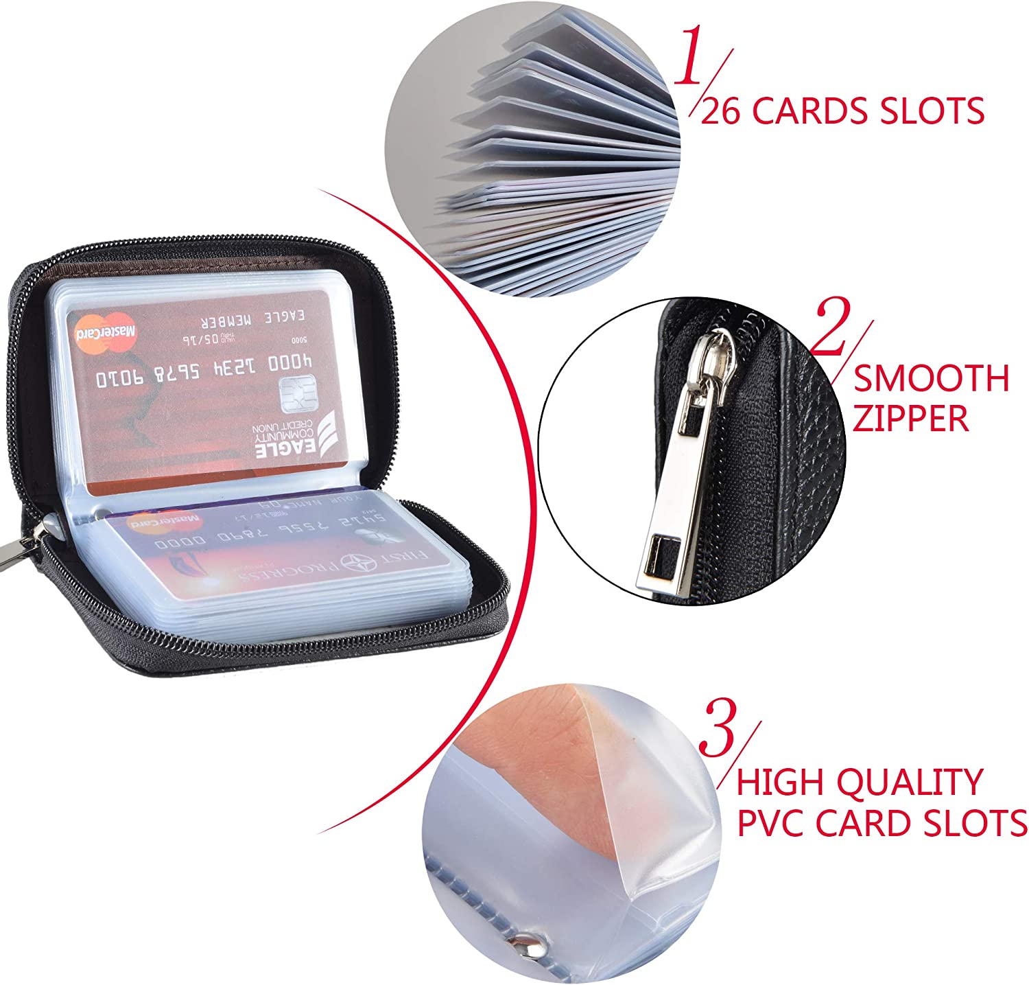 Large Capacity: The card holder has 26 cards slots. It is enough room for your ID card, credit cards, gift cards and dicounted cards. Small size is perfect to fit in your pockets or handbags.