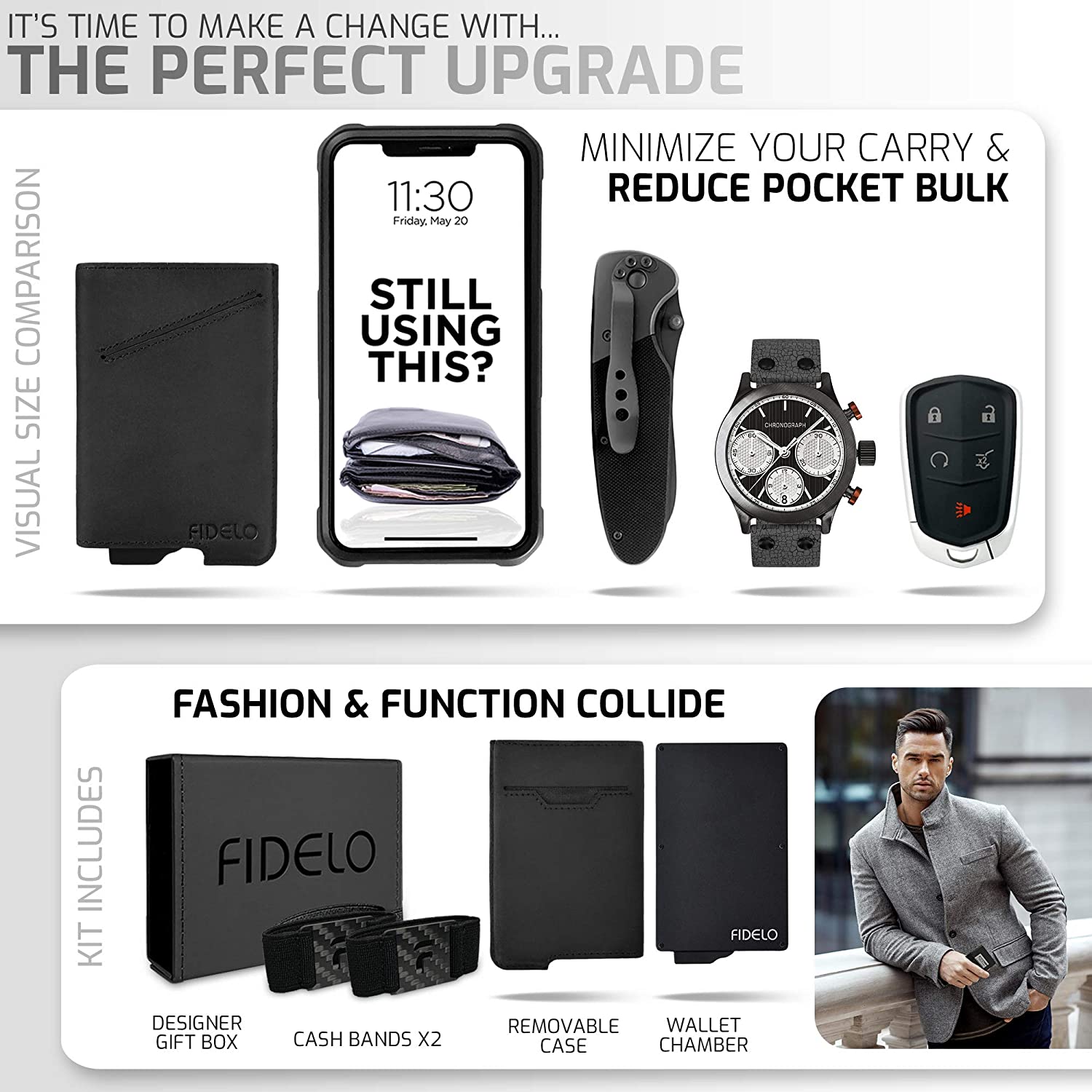 Making a change is never easy. Breaking a routine, changing what we're used to, or simply stepping out of our comfort zone. Just thinking about it can cause endless procrastination and unwanted stress. BUT...once made, we find ourselves in a euphoric state of relief. Pondering “Why didn’t I switch sooner ~ this is so much better ~ I’ll never go back”! I experienced these exact feelings myself. Finally retiring my overstuffed traditional back pocket wallet. “How Great Is This I thought”. Before - annoyed, not knowing where to even keep my gigantic wallet. Now - amazed, unable to even feel the new style in my pocket. Discovering the many benefits, a more modern, front pocket slim wallet offered was life-changing for me. I felt lighter in mind & body, more organized, trendy, and surprisingly younger with less back pain. It was at that moment, it became crystal clear. A minimalist approach had provided huge benefits in my life and could in others as well. FIDELO was born...and with it, a mission: to empower users with unique and stylish products. Encompassing “Simplicity, Functionality, Quality and Ultimately - Peace of Mind“.