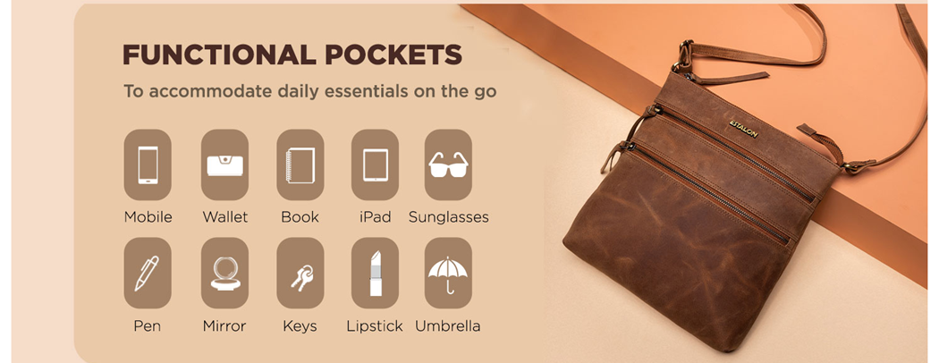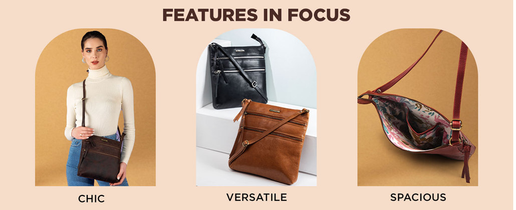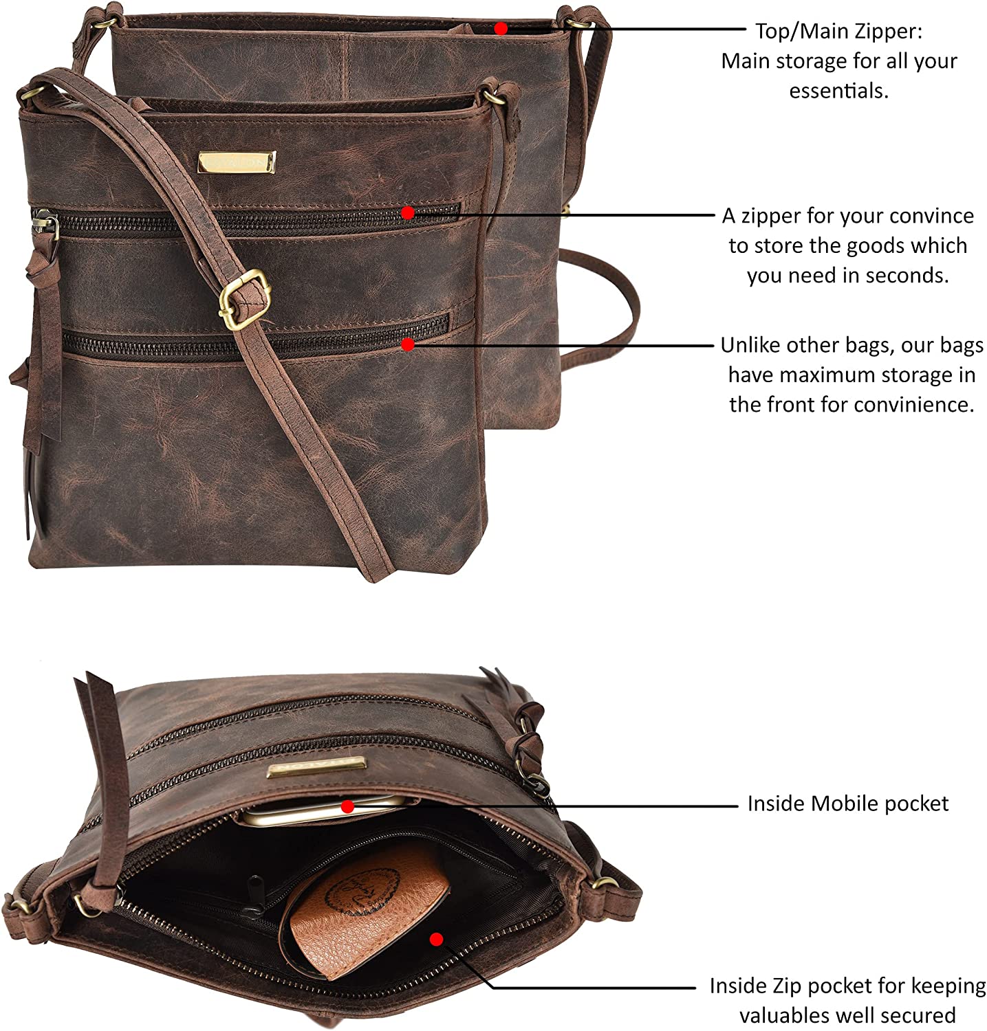 • SMART CONSTRUCTION & STYLE: All a women’s purse needs are spacious compartments and gorgeous looks and our handcrafted cross body bag fulfills both. This handcrafted multi-pocket women’s purse has 3 exterior zip compartments, 1 interior zip compartment, a fully lined bill compartment, and a mobile holder to carry your belongings. Our handbag 9.5 x 9 x 2 inches and comes with a strong strap buckle fitting which gives it a sleek and modern aesthetic look.