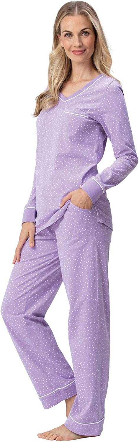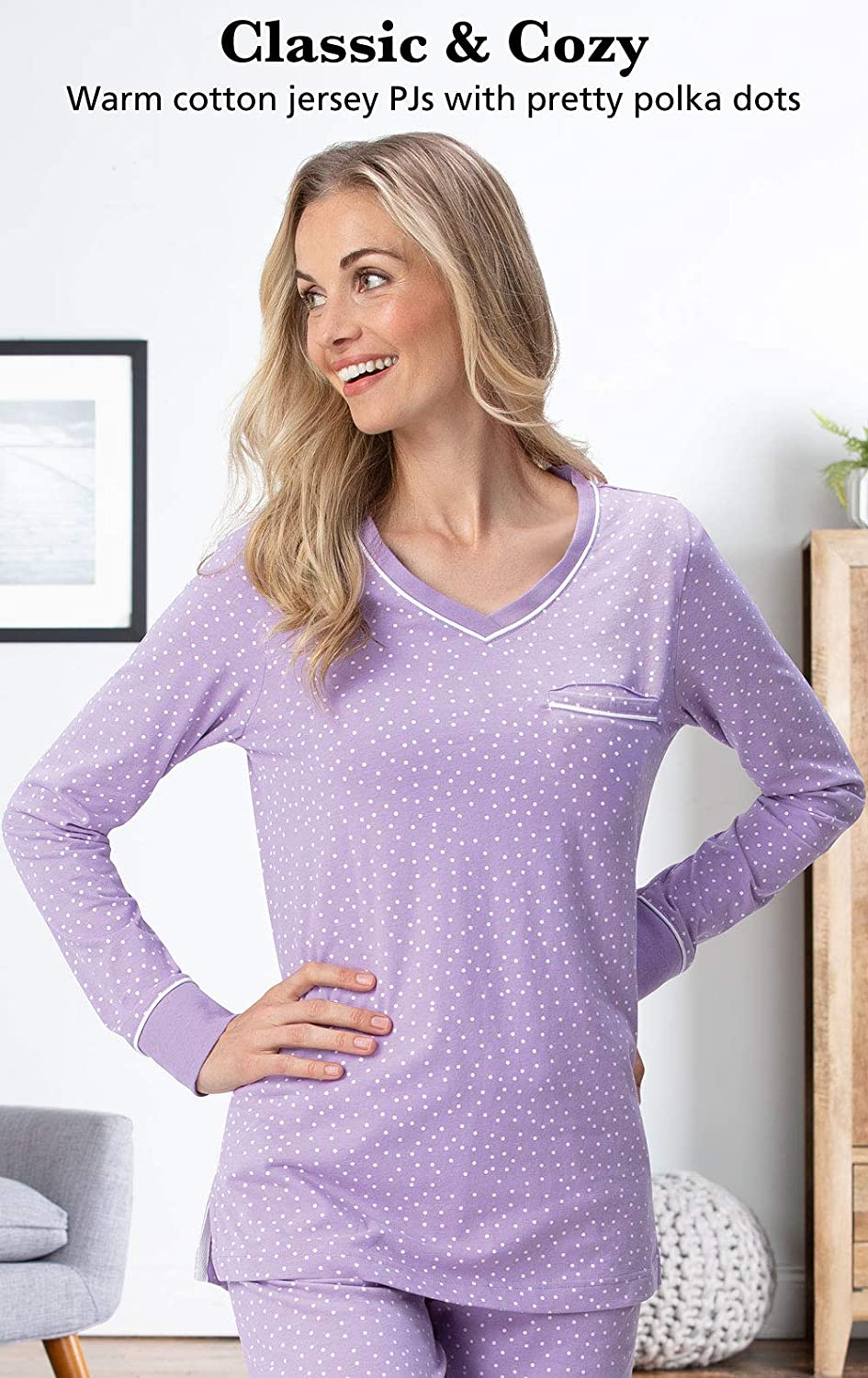 Two-Piece Pullover PJ Set - Women's cotton pajama set features a long-sleeve v-neck shirt with rounded hem and chest pocket; matching long pajama pants with an elastic drawstring waist; pj set for women is available in our classic polka dots or rich solids, with contrast trim.