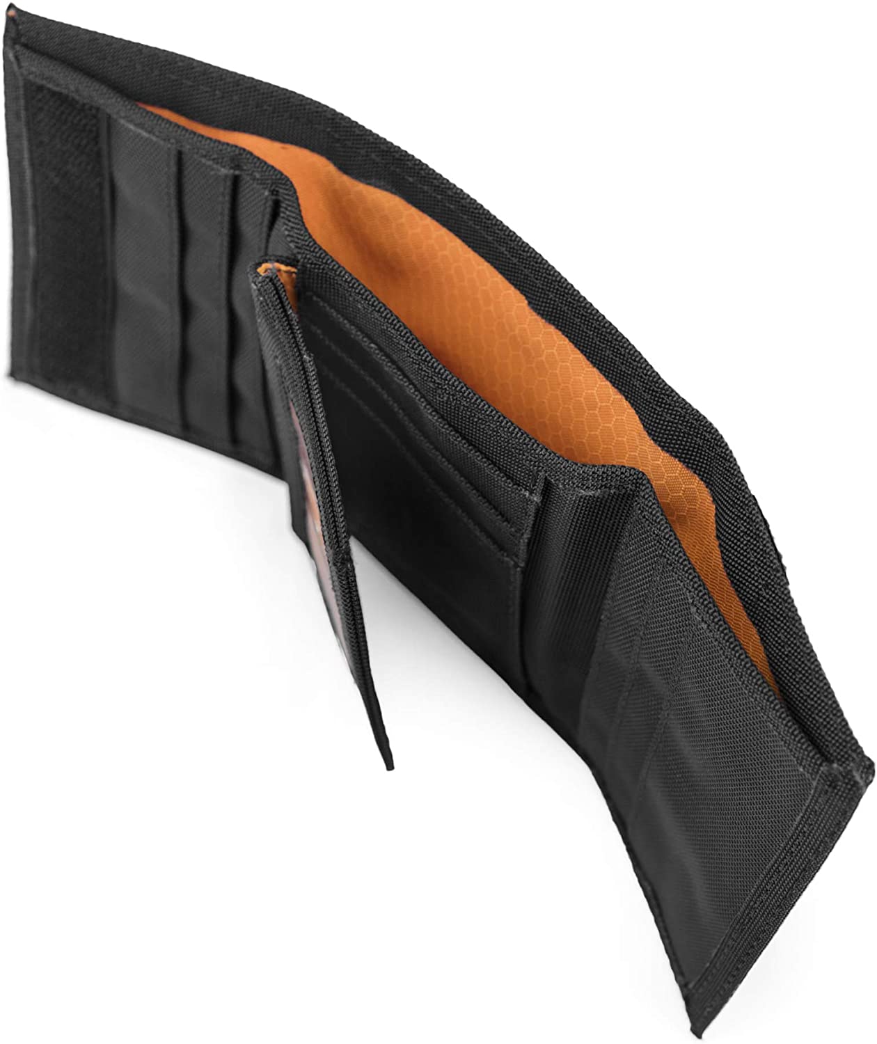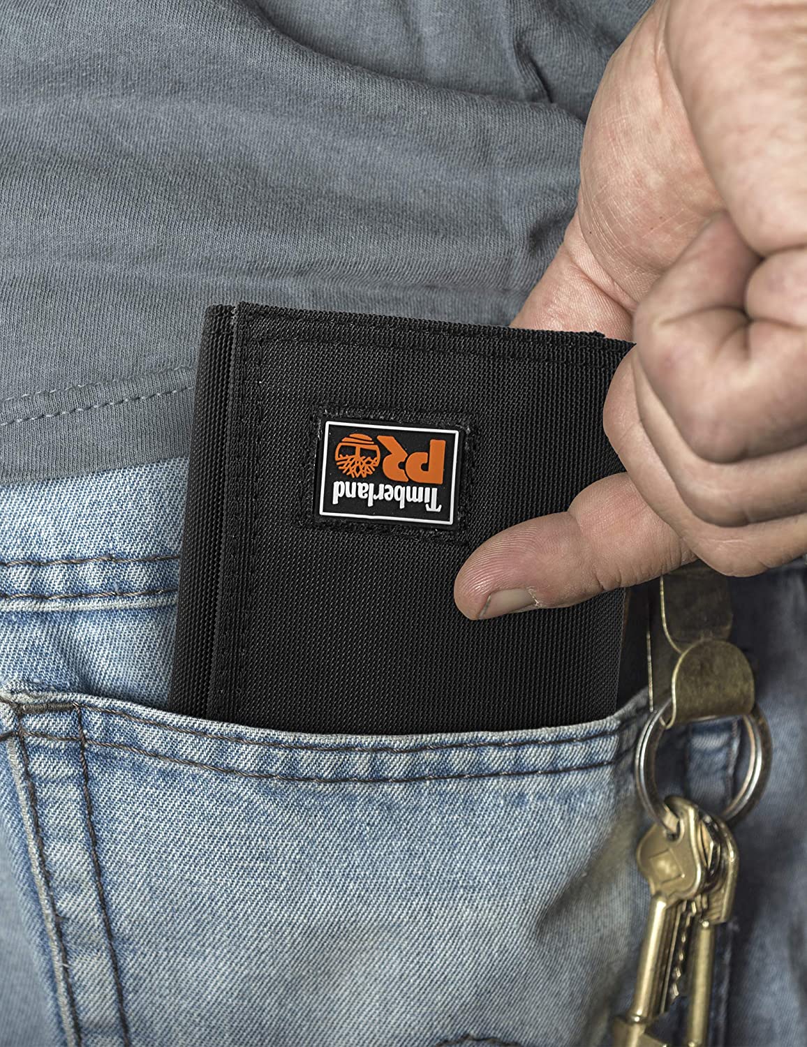TIMBERLAND PRO CORDURA RFID BLOCKING TRIFOLD WALLET - A trifold wallet with lots of storage, 13 credit card pockets, 1 cash bill pocket, 1 ID window, RFID Protection, a Gift Box and a hook and loop closure.