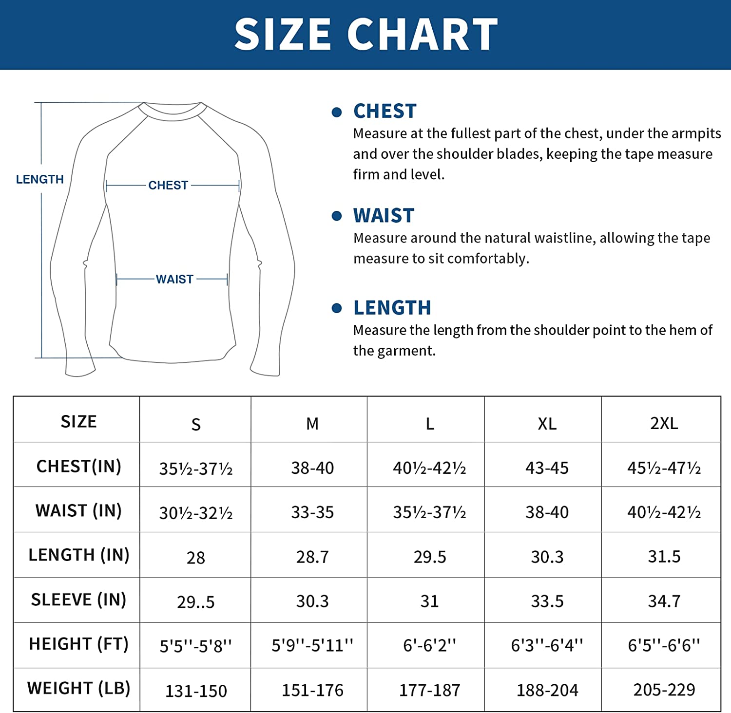 【IDEA FOR ALL OCCASIONS】-This sun shirt is suitable for surfing, fishing, running, hiking, camping, workout and other outdoor activities. Reference Size: S: CHEST: 35.5"- 37.5", WAIST: 30.5"- 32.5", LENGTH: 28" / M: CHEST: 38"- 40", WAIST: 33"- 35", LENGTH: 28.8" / L: CHEST: 40.5"- 42.5", WAIST: 35.5"-37.5", LENGTH: 29.5" / XL: CHEST: 43"- 45", WAIST: 38"- 40", LENGTH: 30.25" / XXL: CHEST: 45.5"- 47.5", WAIST: 40.5"- 42.5", LENGTH: 31.5"