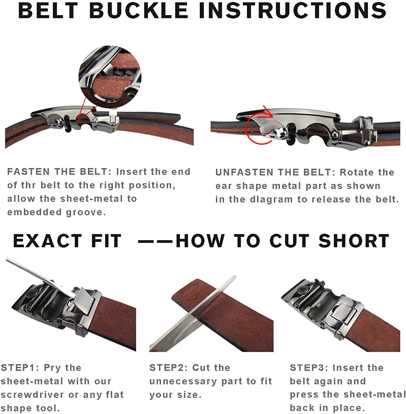 - Easy to use! Trim to fit! If the slide leather belts is too long for you, don't worry, just open the buckle, remove it and easily trim the strap to the best length you need. Easy removable buckle enables cutting the ratchet belts to any length you want. Additional gift : Maikun specialized mini screwdriver, can help you easily open the buckle.