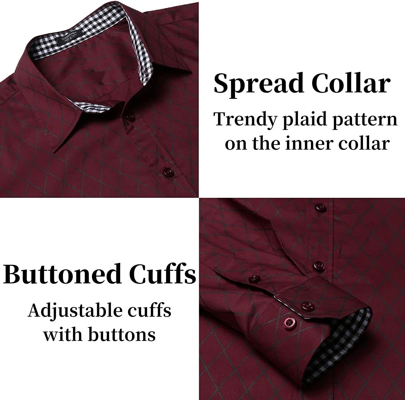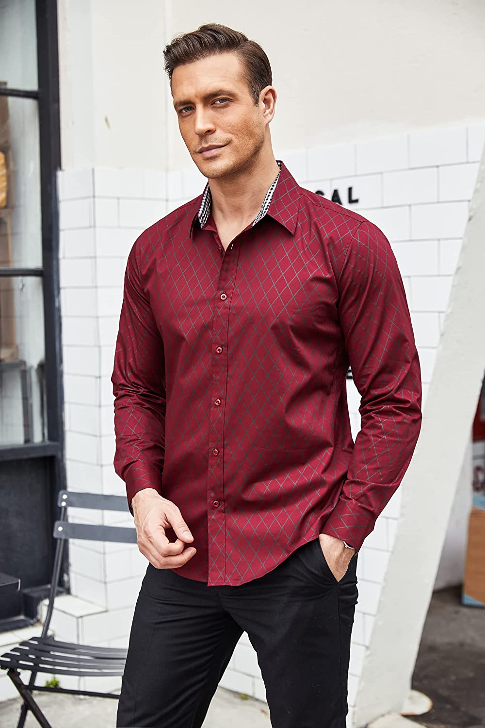 - 【Classic Design】Mens long sleeve dress shirts, designed in slim fit and diamond pattern, featuring with contrast plaid collar and cuffs, button down closure, adjustable cuffs. Make you sharp and attractive.