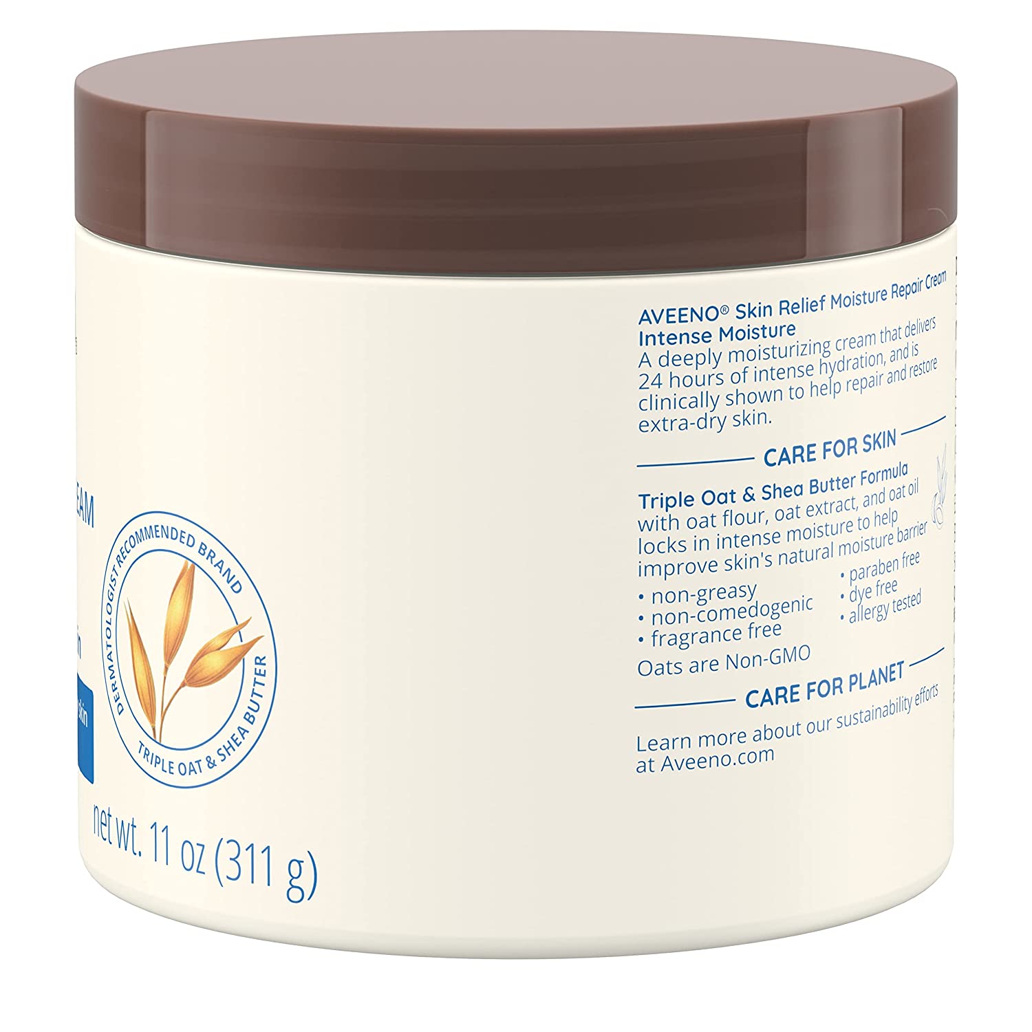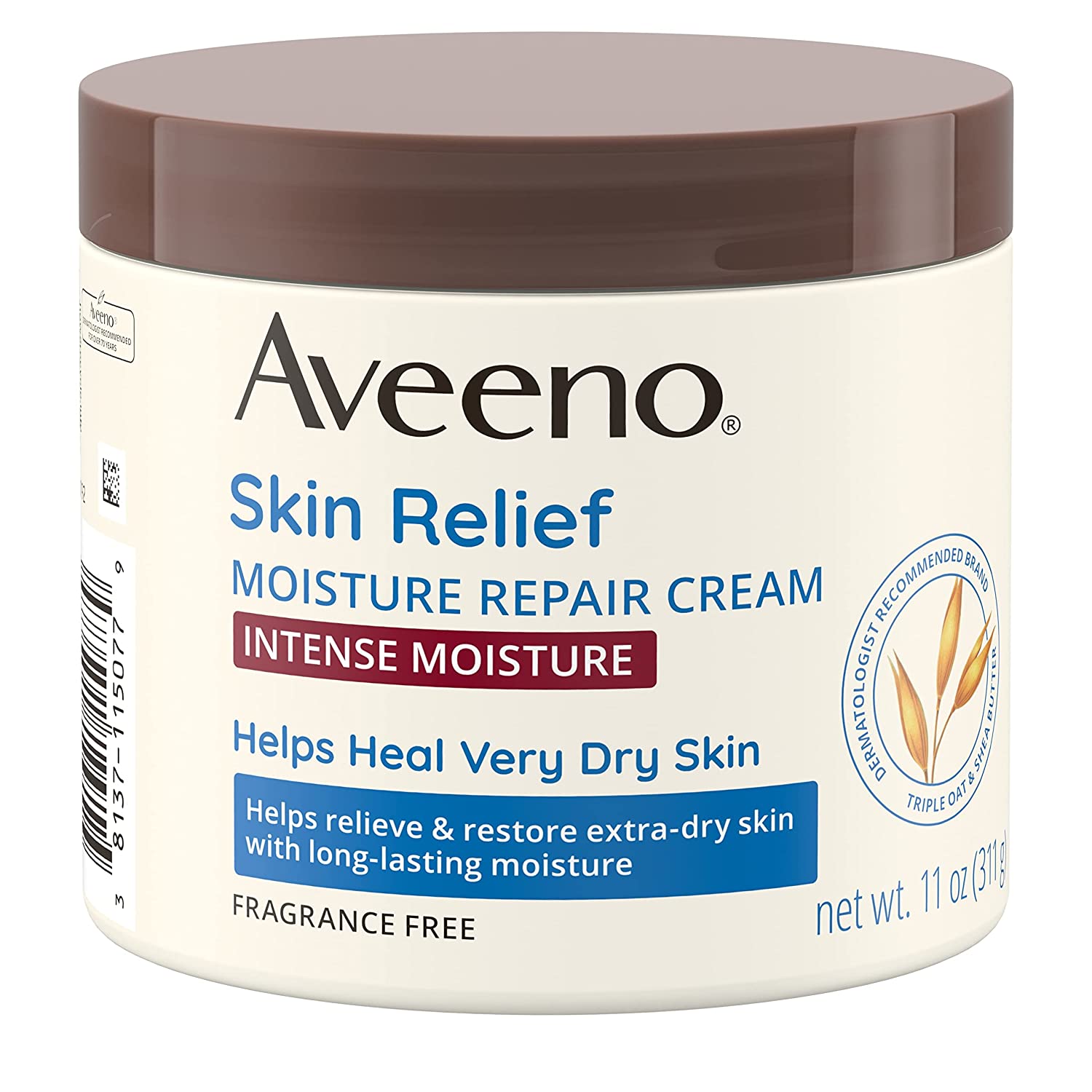• 11-ounces of Aveeno Skin Relief Moisture Repair Body Cream with a Triple Oat and Shea Butter formula is fragrance-free and helps relieve and restore extra-dry skin with long-lasting moisture