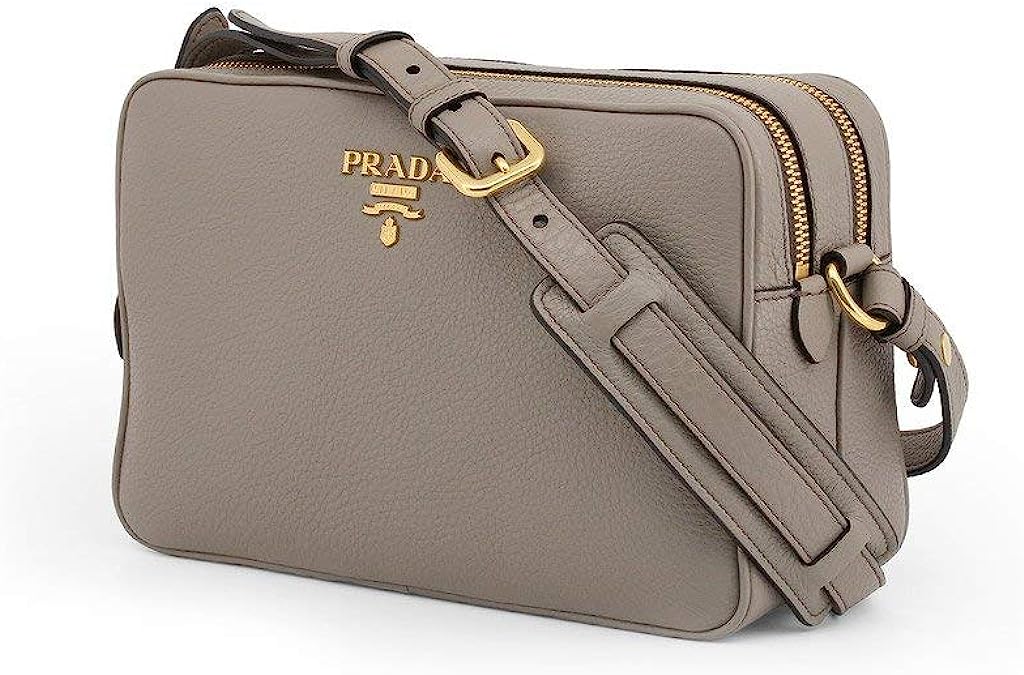 This crossbody bag is crafted with argilla grey vitello phenix leather. The bag features a gold Prada Milano logo on the front and an adjustable leather strap. The two zipper compartments open to a spacious jacquard lined interior that allows for convenient storage and organization. This Prada handbag is great for everyday use with the distinctive quality and style of Prada!