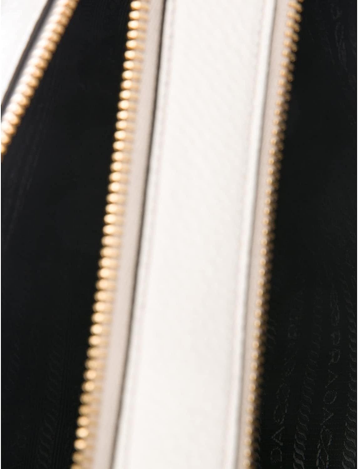 The two zipper compartments are great for storage and organizing your personal belongings. The gold toned hardware and Prada Milano logo goes beautifully with this white Prada handbag. Model: 1BH079 Material: Vitello phenix leather Color: Bianco white