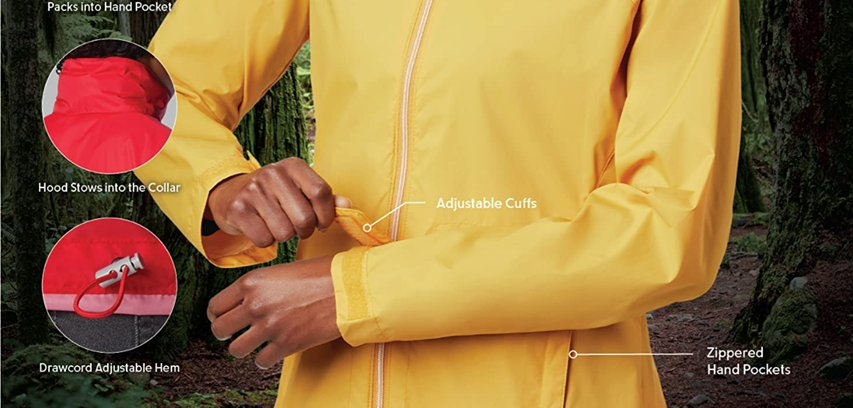 - HANDY FEATURES: Completely waterproof, adjustable cuffs, drawcord adjustable hem, two zippered hand pockets, and the whole jacket packs down into its own pocket for easy toting.