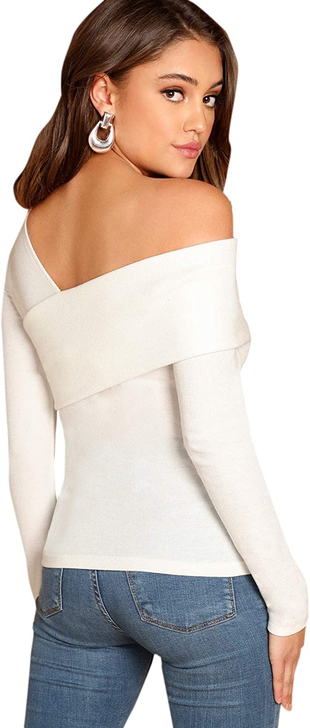 Romwe Women's Casual Cross Off Shoulder Deep V Neck Ribbed Knit Slim Wrap Tee Shirt Blouse