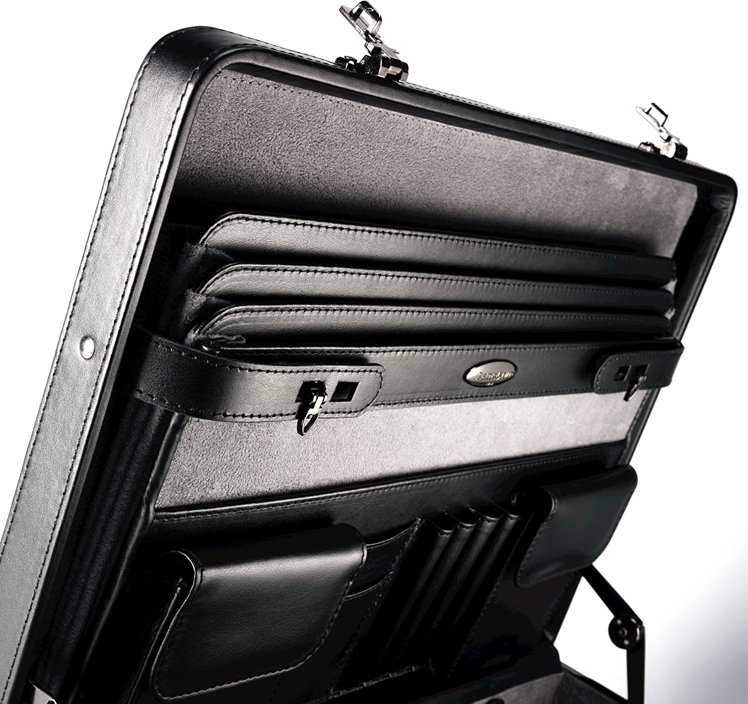 • expandable 3-tier, 4-file organizer; Padded top carry handle; Black nickel combination locks