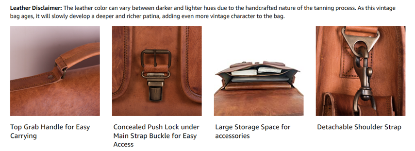 - ELEGANT DESIGN : Now this is one design which can never go out of style . In addition this leather as a characteristic ages wondefully with use which makes the bags look vintage and unique .