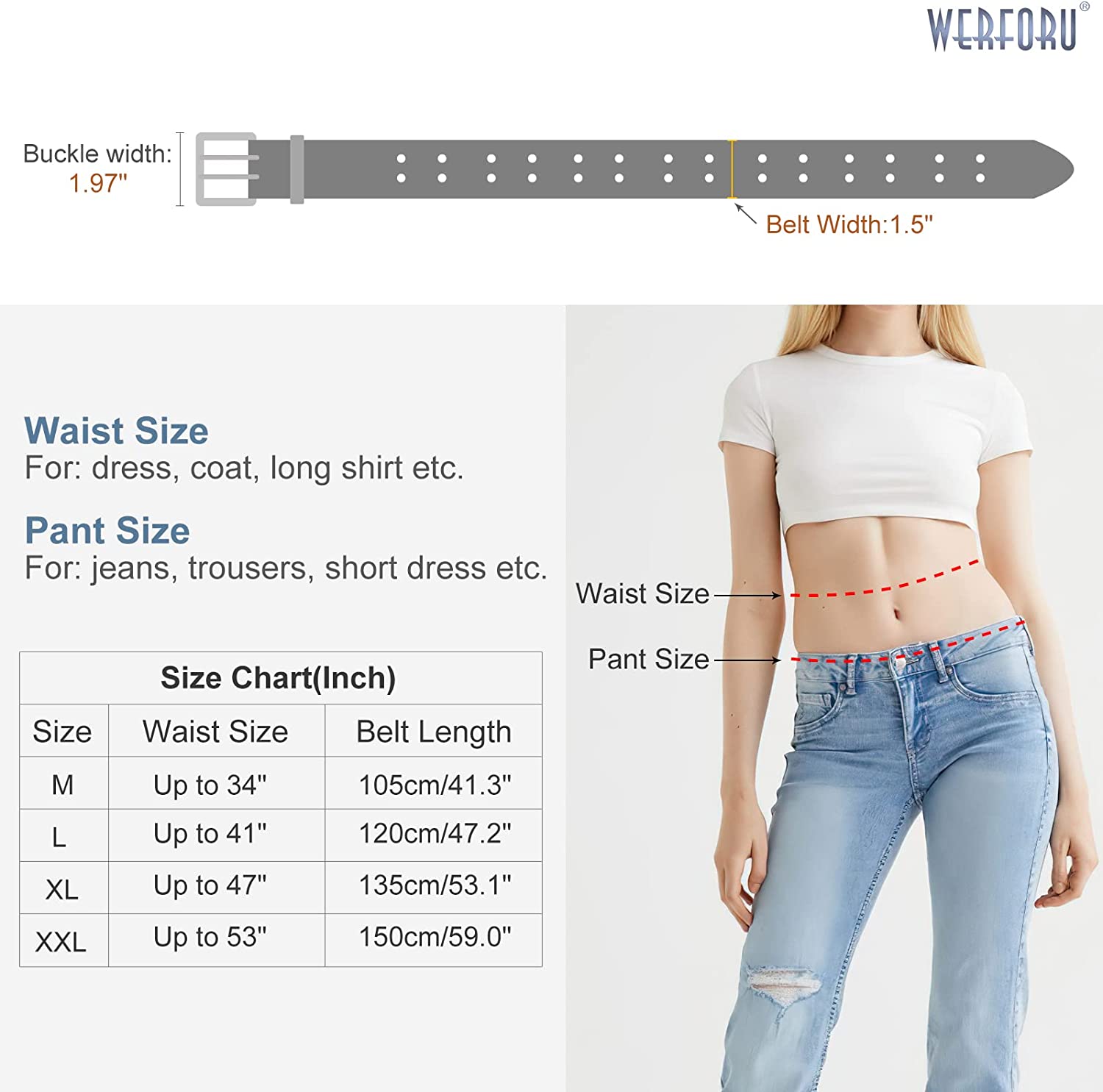 • ?Size for Leather Belt: Double grommets cover the whole strap is quite adjustable for different waist sizes. M fit waist size below 34".L fit waist size below 41".XL fit waist size below 47".2XL fit waist size below 53". This lady belt covered with holes is 1.5" wide that fit most pant loop. Because the grommets go all the way around the belt, you can continue to wear the belt even if you lose/gain weight.