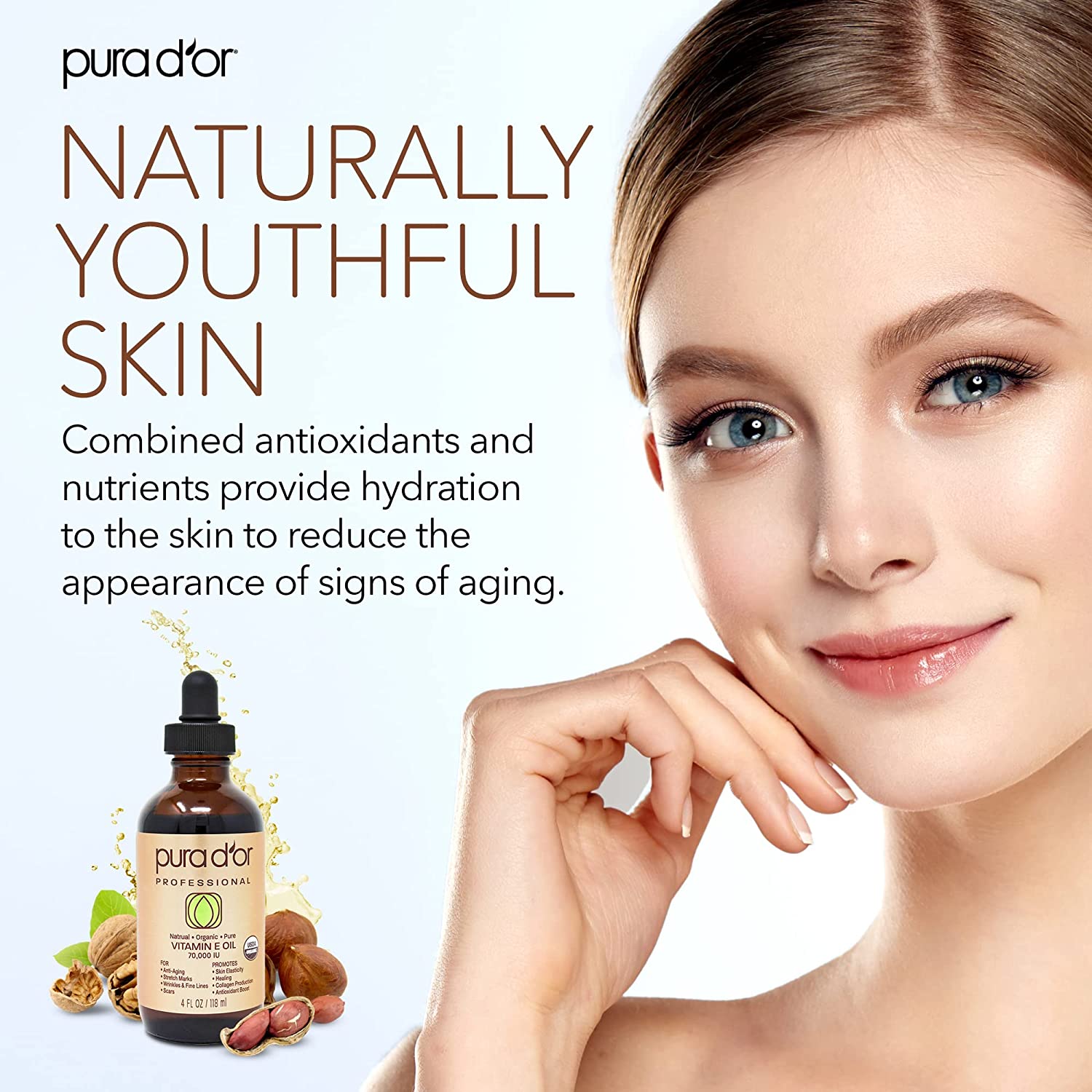PURA D'OR Organic Vitamin E Oil Blend 70,000 IU (4oz / 118mL) 100% Natural Hexane Free, Sweet Almond, Apricot, Jojoba, Argan, Rosehip, Sunflower & Avocado Bath Oil for Scars, Skin, Face & Full Body