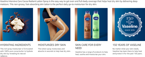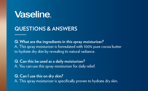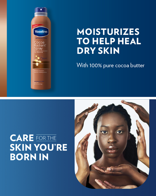 Vaseline Intensive Care Cocoa Radiant Lotion Spray is the easy way to get even and full-body coverage that helps heal dry skin by delivering deep moisture. Vaseline is clinically proven to keep skin healed for 3 weeks (after using daily for 4 weeks), this non-greasy, fast-absorbing skin lotion is the perfect daily go-to moisturizer for dry skin. Our original healing microdroplets of Vaseline Jelly allow the skin’s natural barrier to recover by locking in that moisture. And when combined with 100 percent pure cocoa butter, an ingredient known to bring out the skins natural glow, it’s the ideal moisturizer for relieving everyday dryness while enjoying dewy glowing skin. Utilize Vaseline's Spray Lotion to enjoy instantly softer skin after showering, or whenever your skin feels dry. Vaseline Cocoa Radiant Spray On Lotion is the perfect daily body lotion for maintaining smooth, soft skin. The non-greasy formula relieves dry skin quickly by penetrating deep into skin’s layers, and it helps smooth rough skin, so skin feels soft and healthy. For best results when you have limited time, spray this body moisturizer over your body after you get out of the shower. Vaseline spray lotions are dermatologist-tested and approved and have been designed for easy application and even all-over coverage.