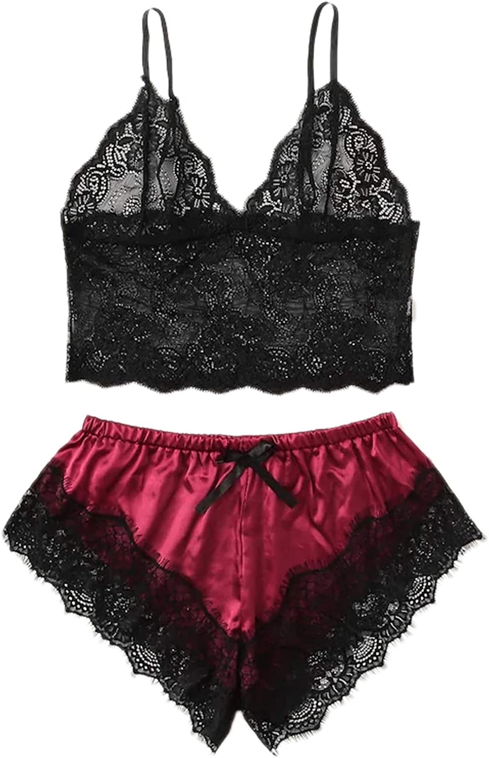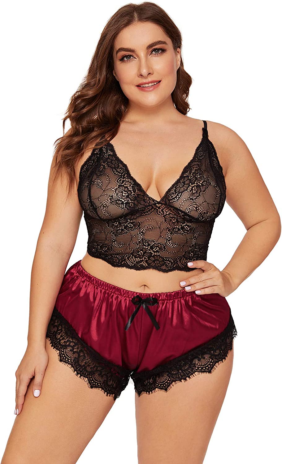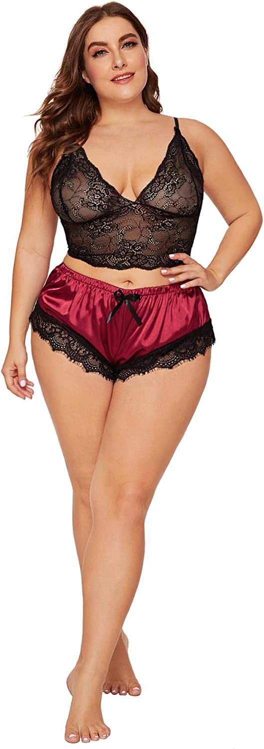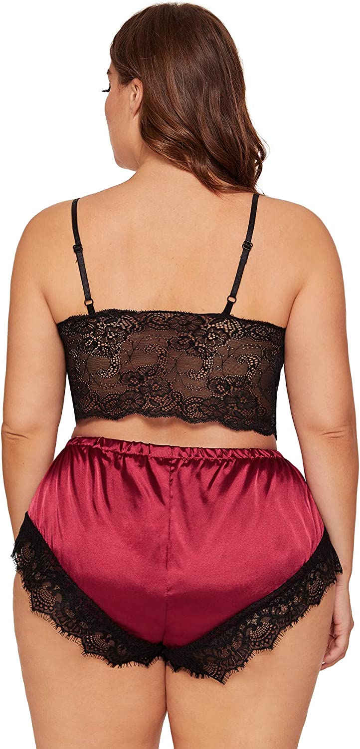 SOLY HUX Women's Plus Size Lingerie Set Spaghetti Strap Lace Trim Bralette and Shorts Sleepwear Pajama Set