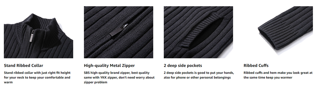 FABRIC:32% Acrylic, 62% Cotton, 6% Polyester, high-end quality soft comfortable long sleeve knit full zip sweater men