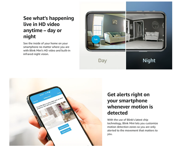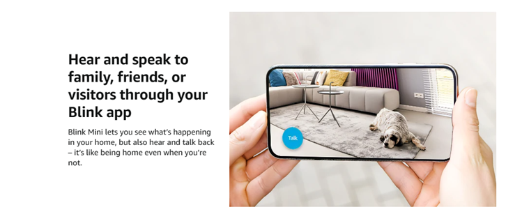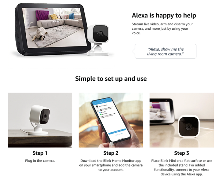 Works with Alexa — pair Blink Mini with a supported Alexa-enabled device to engage live view, arm and disarm your camera, and more using your voice.