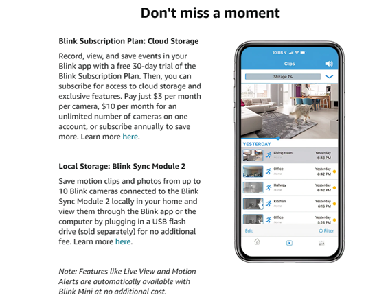 Choose to save and share clips with a free 30-day trial of the Blink Subscription Plan or locally with the Sync Module 2 (sold separately).