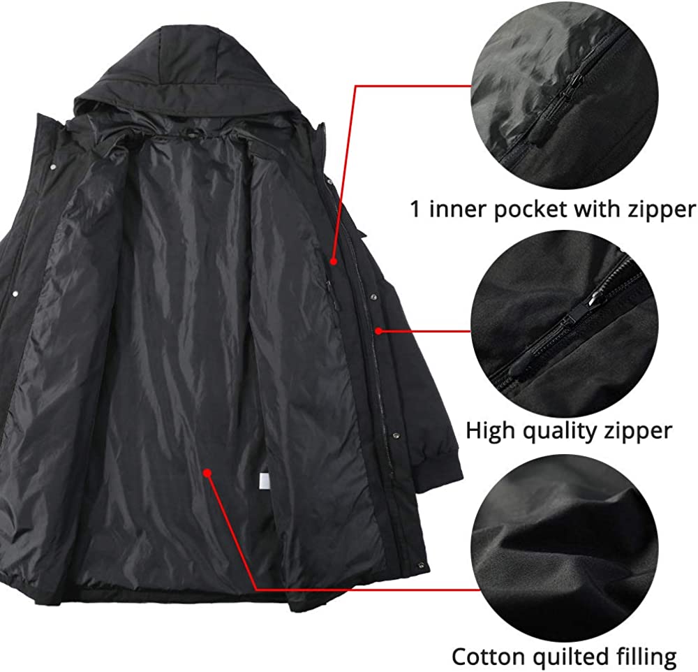 • DESIGN 1: Water-Repellent shell fights bad rainy or misty weather, keep your body dry and warm; down cotton quilted filling provides perfect warmth and comfort in cold fall and winter; total 7 pockets, 2 deep pockets and 1 inner pocket with zipper to keep personal stuff safe, 2 side pockets to keep hands warm, 2 small pockets in the left arm make it more fashional; hooded design with Drawstring prevents cold air