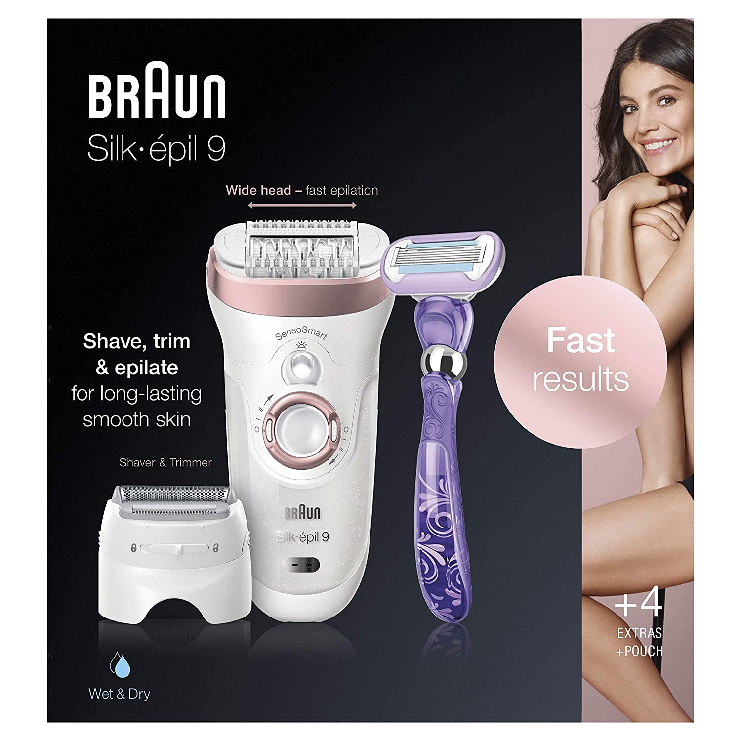 The Braun Silk-epil 9-870 with a wide head for ultra fast epilation. Enjoy weeks of salon-smooth skin thanks to micro-grip technology and a 40% wider head that removes hairs as short as 0.5mm. The shaver and trimmer head gives you added options for sensitive areas and the epilator for Women is 100% waterproof, which means you can epilate in the bath or shower for a painless experience. Box includes: 1 x epilator 1 x shaver head 1 x trimmer head 1 x pouch 1 x Venus razor 1 x cleaning brush 1 x charger