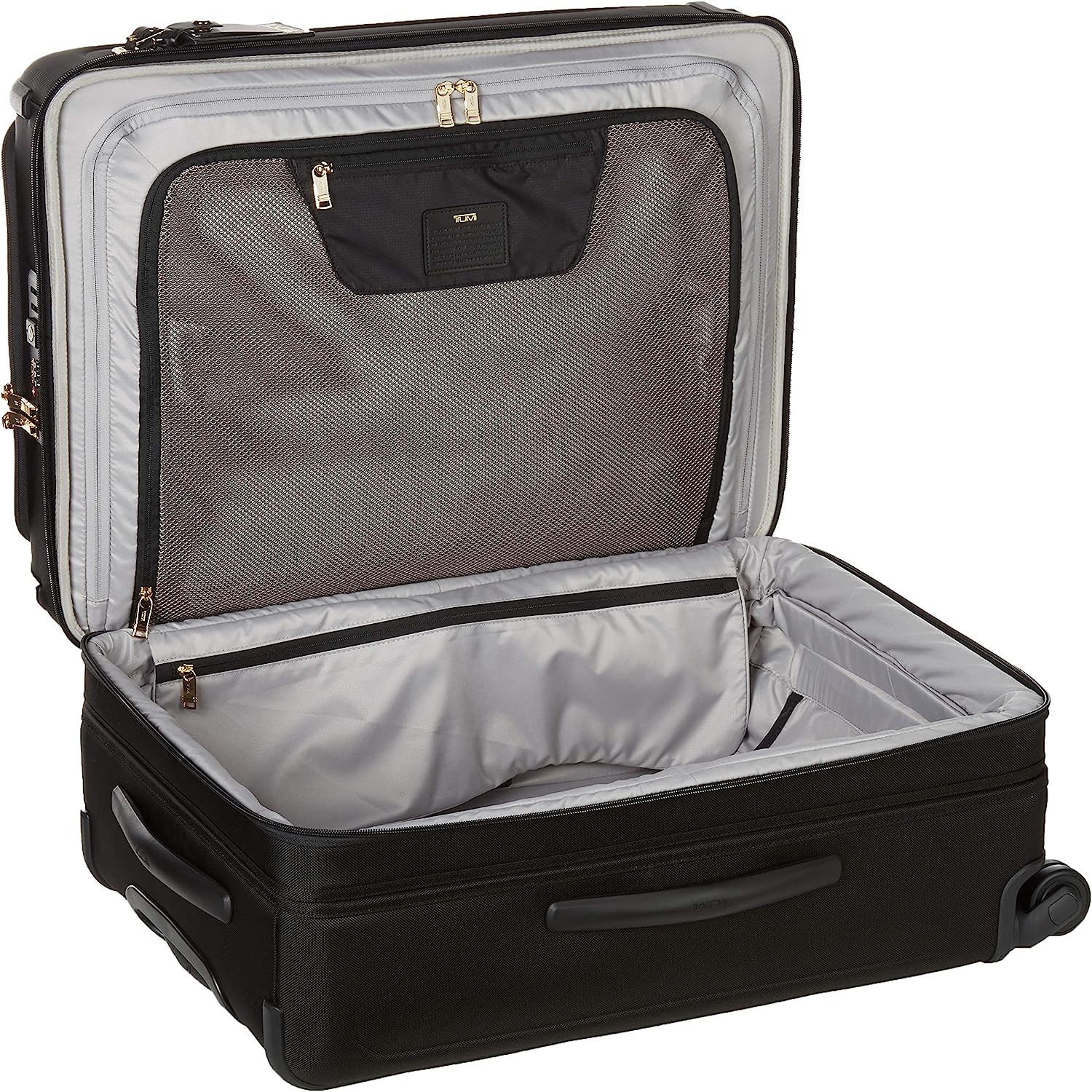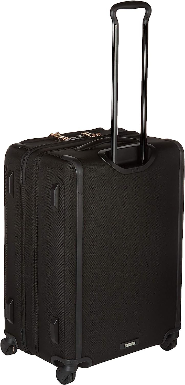 • Exterior Features: Split case zip entry to main compartment with security zipper, Large front U-zip pocket with security zipper, Front U-zip pocket, Gusseted front straight-zip pocket, Retractable top and side grab handles, Bottom grab handle, 3-stage telescoping handle, 4 dual spinner wheels, Molded impact-resistant side panels, Protective bumper rails, Built-in TSA combination lock, TUMI Tracer