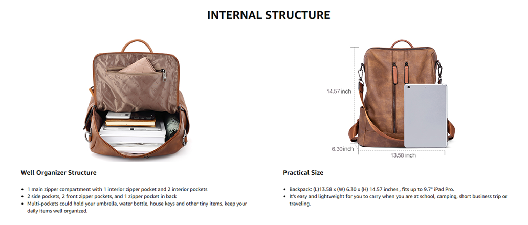 [PRACTICAL STRUCTURE]: 1 main zipper compartment with 1 interior zipper pocket and 2 interior pockets, 2 side pockets, 2 front zipper pockets, 1 zipper pocket in back. Multi-pockets can hold your 9.7" iPad Pro, magazines, umbrella, water bottle other tiny items. You can use it as everyday backpack or travel backpack.
